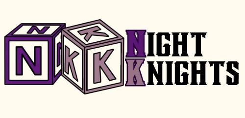 - 2 purple and grey building blocks with N, K on. to their right the game title Night Knights is written in black barring a purple N and grey K