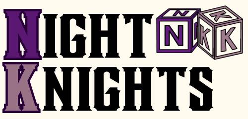- The game title Night Knights is written in black barring a purple N and grey K. To its right are 2 purple and grey building blocks with N K on.