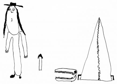 - childs pen drawing of woman standing next to a small pickaxe, a dinosaur skull, and a tent. She has long hair, a hat, and a kissy face expression.