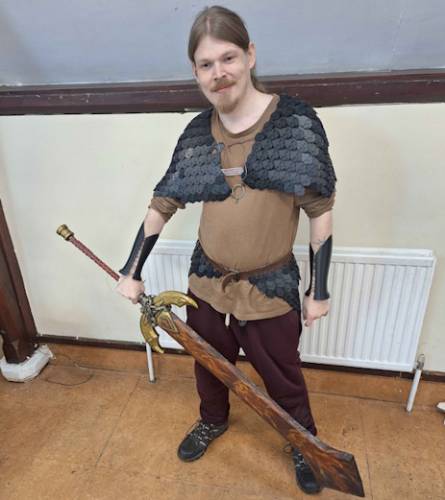 - photo of Tom wearing tan long sleeve undershirt, red trousers, black scalemail armour of interlocking skull faces is worn on the shoulders and waist, and black leather vambraces on the forearms. Tom is holding a foam two handed greatsword painted to look like flames, with a gold and red hilt.