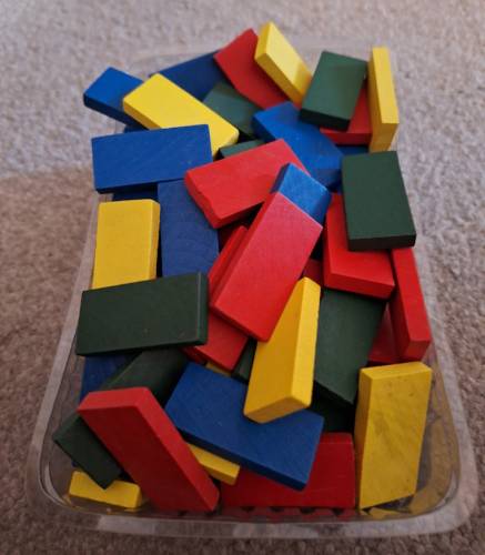 - a clear tub of yellow, red, green, and blue wooden building blocks approximately the same size and shape as a standard domino piece