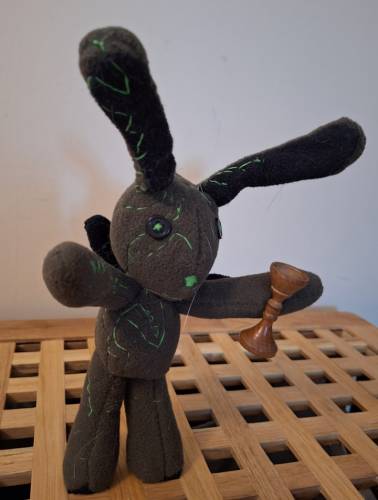 - grey humanoid felt rabbit doll with black wings and button eyes, green thread making veiny computer board patterns across its body. Its holding a small wooden trophy (thats the best description I can do sorry, I have no idea what its actually called, grandma called it a thimble but its like an egg cup and an egg timer had a baby.)