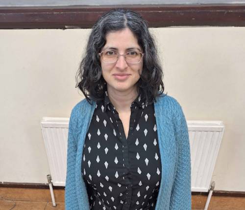 photo of Amy wearing a cyan knitted cardigan open over top of a black button up shirt with a repeating white kite shape pattern