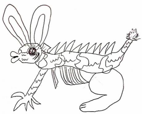- a black and white ink drawing of a fish headed creature with oversized fish lips and rabbit ears. Its has a dragon body and tail, ending in a fluffy rabbit tail. it has spines along its back and is covered with scales and patches of fur. Underneath it has a dragon leg and claw, fish fins, and a rabbit leg and foot.
