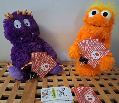 - fluffy purple monster toy (from warmies) with 4 golden horns and orange fluffy muppet like creature with yellow feather hair (from what the fuzz puppets) look into the camera while holding red and white backed happy family cards. a pile of face up cards are in front of them as if in mid game