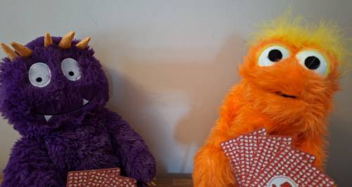 - fluffy purple monster toy (from warmies) with 4 golden horns and orange fluffy muppet like creature with yellow feather hair (from what the fuzz puppets) look into the camera while holding red and white backed playing cards