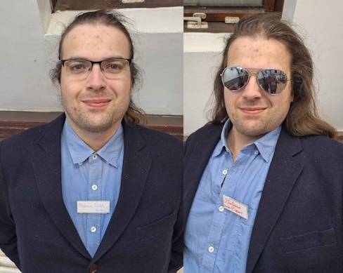 - 2 photos of Zac. Left hand image is wearing hair tied back, glasses, a buttoned up dark blue blazer over top of a fully buttoned light blue shirt, and a name badge for Mailman Matt. Right hand image is wearing hair down, aviator sunglasses, an unbuttoned dark blue blazer over top a partially unbuttoned light blue shirt, and a name badge for Stuntman Sam.