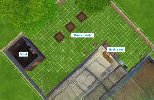 - Angled image of grass covered garden, 2 trees are outside the fence at the top of image. Clockwise from center left of image is: brown wooden shed, unlit inside, 3 square raised empty flower beds, 2 bicycles, 2 wheelie bins, and 2 plant pots.