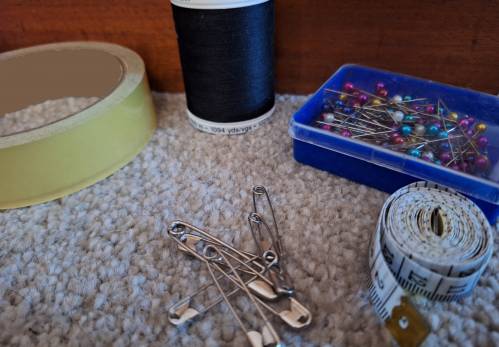 - colour photo of several items to repair a broken toy on the floor. (left to right) clear packing tape, black sewing thread, blue box of multicolored pins, safety pins, and white measuring tape