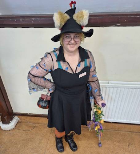 - photo of Tasha wearing a black witches hat with fox ears halfway up and a red flower on the tip, a black knee length dress with meshsleeves adorned with blue flowers, and orange tights. Tasha is holding in left hand a black cauldron with flames up the sides and a red book inside, and the right hand a purple crutch wrapped with ivy and purple and yellow flowers.