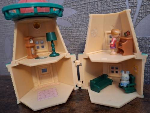 - miniture beige dollshouse windmill interior with 4 rooms, top left room has brown grandfather clock, square window, green floorlamp. Topright: woman figurine plays upright brown piano. Bottom left has beige front door with pink square rug. Bottom left has green sofa, and an ink stained white rabbit sat in a green rocking chair (I got the ink on that rabbit in 1998 and it still apparently will transfer onto your hand even now. Let me tell you i am not impressed)