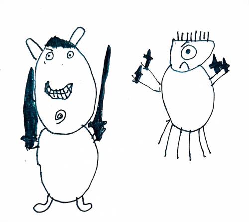 - childs black and white ink drawing of a grinning teddybear with 2 swords, and a frowning monster with 4 daggers. the monster has one eye, 4 arms, and 6 legs.