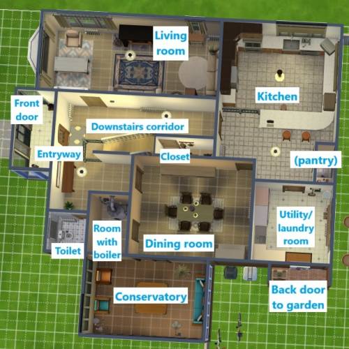 - Sims rendering of large house groundfloor. Front door with porch is on left hand side of image. Starting from the front door and walking a clockwise spiral through the rooms there is: Cream entryway with long corridor to left of front door, stairs in front of front door, closet under stairs, and half table with mirror to right of front door, and black and white downstairs toilet to right of that. Beige and blue colour scheme living room with 3 seating areas, large tv on wall to top of image. Beige kitchen with oval worktop across images top half, breakfast bar in center and pantry in bottom right corner of the room. Utility/laundry room with along images left hand wall; washer, dryer, sink, a bottom wall countertop and back door with porch. Garden bins are stored between back door porch and conservatory. Brown, orange and blue conservatory with wall to wall windows on left and right of room image. Brown and beige dining room with sideboard along images top wall, centred dining table with 6 chairs, and bottom right corner dresser. Beige boiler room with freestanding man sized metal boiler against images top wall. Images room labels as read left to right are: living room, kitchen, front door downstairs corridor, etryway, closet, pantry, toilet, room with boiler, dining room, utility/laundry room, conservatory, back door to garden